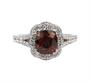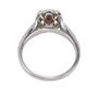 Prsten z bílého zlata ryzosti 750/1000 osazen sytě červeným rhodolitem hmotnosti 1,75 ct a diamanty briliantového brusu celkové hmotnosti 0,50 ct. Velikost prstenu je 57. Celková hmotnost je 5,05 g.