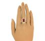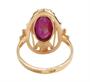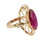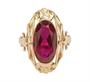 Prsten z růžového zlata ryzosti 585/1000 zdobí syntetický rubín nádherné barvy. Rozměry hlavy prstenu 2,4 x 1,5 cm, velikost 54, celková hmotnost 5,50 g.