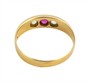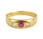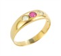 Prsten ze žlutého zlata ryzosti 585/1000 (punc liška) zdobený syntetickým rubínem a leukosafíry. Velikost prstenu 65, celková hmotnost 3,72 g.
