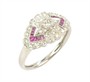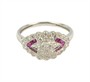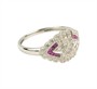 půvabný prsten v art deco tvarosloví z bílého zlata ryzosti 585/1000 osazený přírodními rubíny o celkové hmotnosti 0,10 ct a diamanty briliantového brusu o celkové hmotnosti 0,45 ct (SI-PI/H). Celková hmotnost prstenu je 2,80 g. Velikost 56.