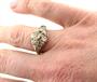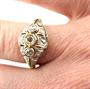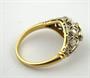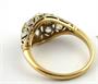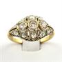 Žluté a bílé zlato, přírodní broušené diamanty. Bílé zlato hlavy prstenu a osazení kamenů o ryzosti Au 750/1000, obroučka prstenu ze žlutého zlata o ryzosti Au 710/1000, celková hmotnost 4,00 gramů. Tři centrální přírodní diamanty starého briliantového brusu o váze 0,40 ct, barva I - J, čistota P2-3. Deset přírodních diamantů výbrusu routa. Osvědčení Puncovního úřadu. Dámský zlatý prsten oblíbeného tvaru období art deco. Kroužek prstenu ze žlutého zlata. Klenutá hlava prstenu zdobená prořezávaným ornamentem. Tři centrální přírodní diamanty moderního briliantového brusu osázené v korunkách. Po stranách osázených 10 přírodních diamantů jednoduššího výbrusu routa. První polovina minulého století. Velikost prstenu 55.