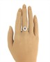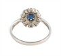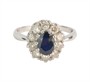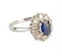 Prsten z bílého zlata ryzosti 585/1000 zdobený safírem rozměrů 6,8 x 5,14 mm a deseti diamanty briliantového brusu celkové hmotnosti 0,50 ct. Celková hmotnost prstenu je 3,47 g. Velikost 58.
