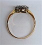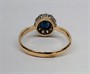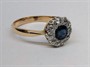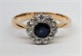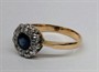 Zlatý prsten se sytě modrým přírodním safírem o průměru 0,5 cm a 11 diamanty briliantového brusu, celkem 0,33 ct, osazenými v koruně z bílého zlata. Celková hmotnost Au 3,86 g/585/1000, punc. Západní Evropa, třetí čtvrtina 20. století, průměr hlavy 1 cm, velikost prstenu 60.
