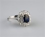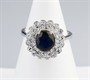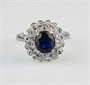Zlatý prsten s přírodním safírem a diamanty briliantového brusu, safír o hmotnosti 1,25 ct, 32 kusů diamantů cca 0,50 ct. Celková hmotnost Au 4,23 g/750/1000, punc. Západní Evropa, začátek 21. století, velikost prstenu 53.