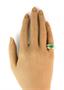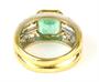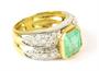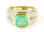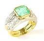 Prsten ze zlata ryzosti 750/1000 je bohatě zdoben diamanty briliantového brusu a krásně zbarveným přírodním smaragdem. Celková hmotnost briliantů je 0,60 ct, barva H, čistota SI. Celková hmotnost prstenu je 7,28 g. Velikost 52. Druhá polovina 20. století.