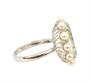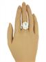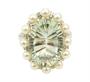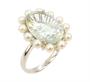 Výrazný prsten z bílého zlata ryzosti 750/1000 zdobený velkým přírodním ametystem jemné, světle zelené barvy o hmotnosti 7,50 ct, dále perlami a diamanty briliantového brusu o celkové hmotnosti 0,08 ct (SI-PI/H). Velikost 57,5. Celková hmotnost 6,32 g.