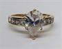 Výrazný blyštivý prsten ze žlutého zlata s hlavou osazenou velkým, kapkovitě broušeným zirkonem a s 8 roháčkovými zirkony na bocích. Celková hmotnost 3,62 g, Au 375/1000, platný britský punc. Velká Británie, poslední třetina 20. století. Šířka prstenu 1,3 cm. velikost 57.