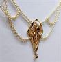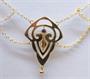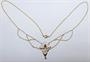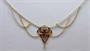 Zlatý secesní náhrdelník s ametystem se závěsem stylizovaného pavézového tvaru. Osazen kruhově broušeným přírodním ametystem o průměru 0,2 cm, po stranách ozdobné kaskádovité řetízky. Celková hmotnost 4,80 g, Au 585/1000, rakousko-uherský dovozový punc AV (Z - 29). Francie, začátek 20. století. Délka závěsu 3,1 cm, šířka 2,1 cm, délka řetízku 44 cm.