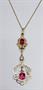 Zlatý pozdně secesní náhrdelník s ametysty ve florálním stylizovaném provedení, zdobený lístky a leukosafírem. Celková hmotnost 5,30 g, Au 580/1000, punc čejka (Z - 36). V horní části osazen oválný přírodní broušený ametyst 0,6 x 0,4 cm, v dolní části obdélný přírodní broušený ametyst 0,7 x 0,6 cm. Československo, první čtvrtina 20. století. Délka závěsu 5,7 cm, šířka 2 cm, délka řetízku 42 cm.