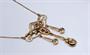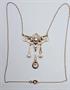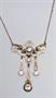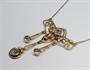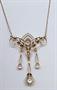 Zlatý pozdně secesní náhrdelník se syntetickými leukosafíry a zdobným florálním motivem. Celková hmotnost 5,47 g, Au 580/1000, punc čejka (Z – 36). Syntetické zářivé leukosafíry kruhového brusu o průměru 0,2 – 0,6 cm zafasovány v soudkovitých obrubách umístěných ve středu a v ověscích. Precizní šperkařská práce, Československo, první čtvrtina 20. století. Délka závěsu 4,8 cm, šířka 3,5 cm, délka řetízku 40 cm.