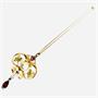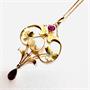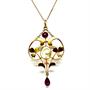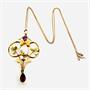 Malebný, zlatý náhrdelník s odnímatelným - ryze secesním závěsem. Řetízek délky 44 cm byl vyroben ze zlata ryzosti 585/1000. Secesní závěs zdobený perletí a rubíny byl zhotoven ze zlata ryzosti 375/1000. Celková váha šperku 3,36 g. Rozměry závěsu 4,5 x 2,3 cm. Starý, autentický šperk v perfektním stavu.