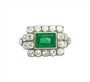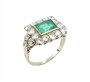 Starožitný prsten z bílého zlata ryzosti 585/1000 je osazen smaragdem bagetového brusu a diamanty celkové hmotnosti cca 1,90 ct. Celková hmotnost šperku je 4,10 g. Velikost 53. Krásná původní zlatnická práce, odborně vyčištěno zlatníkem.
