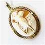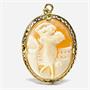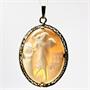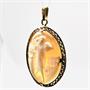 Závěs vyroben ze 14ti karátového zlata (585/1000) a vyřezán z mušloviny. Ve šperku zobrazen zřídka kdy vídaný figurální výjev tančící ženy. Velmi jemná, detailní zlatnická práce. Celková váha 6,05 gr. Velikost 3,6 x 3 cm + 1cm závěsná očka.