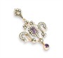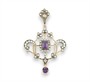 Půvabný secesní závěs ze zlata 585/1000 zdobený přírodními ametysty a diamanty briliantového brusu o celkové hmotnost 1,80 ct. Kameny zasazeny ve stříbře. Rozměry 5,5 x 3,7 cm. Celková hmotnost 7,22 g.