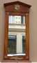Dřevo, zrcadlo, mosaz. V empírovém stylu. Menší zrcadlo zámeckého typu inspirované empírovým stylem. V horní části trojúhelníkového tympanonu originální mosazná ozdoba s motivem orla s trojlistou ratolestí. Odstupňovaná předsazená římsa. Čtyři originální mosazné ozdobné rozety ve tvaru stylizovaného květu růže. V dolní části rokokový mosazný ornament. Profilovaná spodní lišta. Střední Evropa 1900 - 1930. Rozměr zrcadla: 86 cm x 42 cm x 5,5 cm.